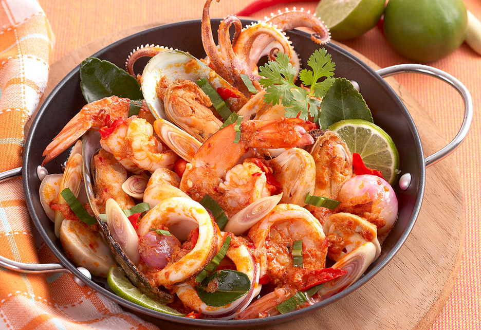 3. Add squid, shrimp, mussel season with Chilli Paste with Chua Hah Seng Brand, Fish Sauce, Thai chilies, Condensed Milk